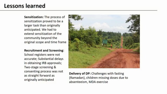 Catherine Maiteki-Sebuguzi from the Uganda National Malaria Control Programme presented the results from the START-IPT trial, which aimed to evaluate the impact of IPT (intermittent preventive treatment) with an ACT (artemisinin combination therapy) in schoolchildren on malaria transmission indicators at the community level. In the schoolchildren in intervention schools, there was a lower proportion of RDT positive and microscopy positive results, together with less history of fever. Parasite prevalence at the community level was not statistically significant between the control and intervention clusters, but a positive trend was seen. Catherine concluded that the results suggest that IPT for schoolchildren benefited the individual children and may reduce malaria transmission within the community. She also shared some of the challenges faced by this form of intervention, such as community sensitization and recruitment through schools; as well as some questions for future studies, such as how to achieve high coverage rates or how to integrate the intervention with other school-based programmes.