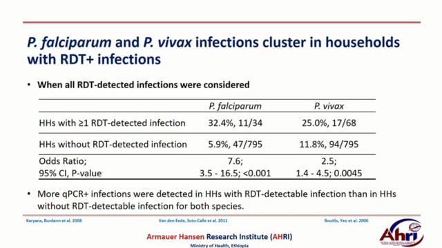 Asymptomatic infections of low and high density are key targets during the elimination phase of malaria. Linking routine health facility data and community surveys from 9 countries, Gillian Stresman’s work concluded that as malaria transmission intensity decreases, the proportion of infections detected by routine passive case-reporting of confirmed malaria illness increases. Fitsum Tadesse’s work in Ethiopia showed that a high proportion of asymptomatic low-density infections clustered around the passively detected and routinely reported cases. Ashenafi Assefa explored how multiplex serological studies could be used to distinguish recent and remote infections and enhance data on infecting species.