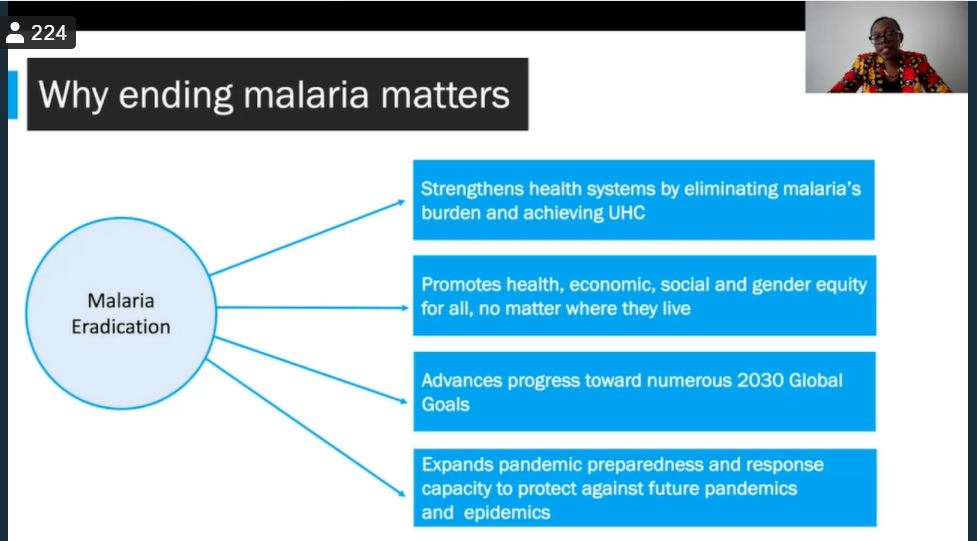 Corine Karema (National Malaria Control Program – NMCP, Rwanda) began her talk by firstly, reminding us why malaria eradication matters and secondly, telling us about the efforts Rwanda has made to reduce its malaria incidence rates. Rwanda’s malaria reduction is attributed to the combined effective use of innovative and transformative tools as well as applying lessons learnt from the COVID-19 pandemic. Karema mentioned that deploying the right prevention tools at the right time to the right places is fundamental to malaria elimination, especially in high-burden countries. This is possible by improving program management, designing strong and sustainable systems and empowering local capacity for efficacious implementation and service delivery. The COVID-19 pandemic emphasised these approaches as countries that valued and invested in strong governance, strategic monitoring, health systems and frontline workers were better positioned to mitigate risks and losses. This is a challenge in Africa where most healthcare systems are fragmented, consequently, disease preparedness and monitoring is fragile thus recovery from severe disease outbreaks is gradual. Currently, many opportunities paving the way for malaria eradication exist and Karema believes that these tools will make it possible to end malaria in a generation.
