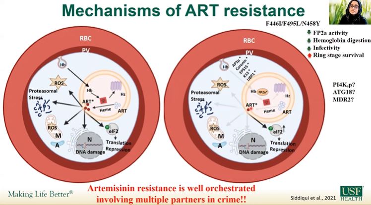 Faiza Siddiqui (University of South Florida, United States of America) discussed various ways to deeply explore molecular markers involved in artemisinin resistance with a great focus on PfK13. Siddiqui and team used a green fluorescent protein to study the expression and localization of PfK13 protein in asexual and sexual stages. Some of the K13 mutations tested show lower fitness and higher ring stage survival under drug pressure They used a new antibody against PfK13 to show that the PfK13 protein is expressed ubiquitously in both asexual erythrocytic stages and gametocytes and is localized in punctate structures, partially overlapping an endoplasmic reticulum marker. She partially concluded that some parasites showing resistance phenotypes lack K13 mutations. Siddiqui highlighted the need to identify additional markers of resistance. Artemisinin resistance selection using Dd2 strain and genome sequencing has identified SNPs in other genes (e.g. PI4K, ATG18 or MDR2). Further studies determining all contributors towards resistance are needed.