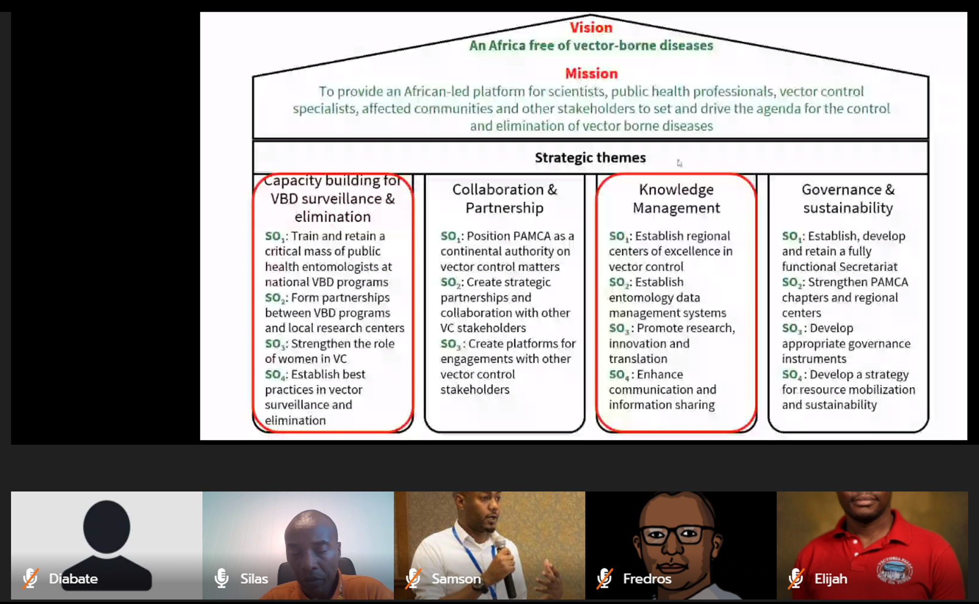Keziah Malm (National malaria Control Program – NMCP, Ghana) presented vector control as a core intervention in the fight against malaria especially in high-burden countries Africa-wide which has mainly involved insecticide treated nets (ITNs) and indoor residual spraying (IRS). She recommended that malaria surveillance be implemented as a core intervention including the identification of vectors, species diversity, habitats and monitoring the impact of implemented control measures. She mentioned that according to Russel et al., 2020, 80% of countries use vector data for decision making, the remaining 20% don’t, mostly due to inadequate finances and human resources. Ghana has already launched entomological surveillance in 30 insecticide resistance monitoring sites amongst which 20 sentinel sites are also used for entomological surveillance. A wide range of entomological indicators were monitored such as vector diversity, abundance, among others. Malm mentioned the example of the National Insecticide Resistance Monitoring Partnership (NIRMOP) as a case study conducted in the Obuasi-Ashanti region in Ghana. NIRMOP brings together researchers and partners in malaria vector control to plan, conduct, and evaluate results of insecticide resistance testing at sentinel sites throughout the country. The project has produced some preliminary findings highlighting gaps in the entomological surveillance involving limited funding, lack of capacity in entomology amongst others that need to be filled. To end the presentation, she made a call to action to donors, WHO, Africa CDC, NMCP, PAMCA, RBM, governments and other stakeholders to collaborate and develop a strategic plan and also build capacity in vector control that could lead to informed decision-making for better vector control management strategies.