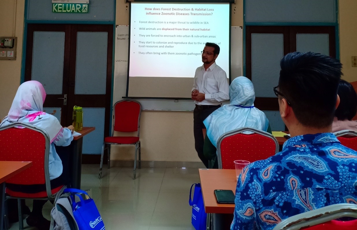 This lecture was given by Dr Reuben Sunil Kumar Sharma, veterinarian and veterinary parasitologist from the University Putra Malaysia. In the initial session, Dr Reuben Sunil Kumar Sharma pointed out that forest destruction is a major threat to wildlife in Southeast Asia, which includes the long-tailed macaques. The macaques are being displaced from their natural habitats, being forced to encroach into urban and suburban areas. Subsequently, they have started to colonise and reproduce due to the availability of food resources and shelter. This situation narrows the gap between the human-wildlife interface, and therefore, the zoonotic wildlife diseases are more common due to increased proximity between the infectious agent, host, environment and vector.
