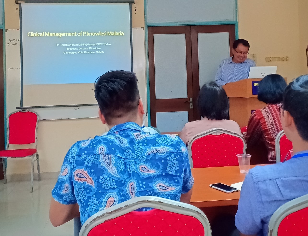 Plasmodium knowlesi has been microscopically misidentified as P. malariae, P. falciparum and P. vivax and often associated with case fatalities due to the lack of severe disease recognition and delayed parenteral artesunate. Dr William also shared his knowledge on the drug treatments for the cases of uncomplicated and severe knowlesi malaria. Other supportive therapies such as fluid management, renal replacement therapy, inotropes, respiration ventilation, and blood transfusion were also briefly explained to the participants. The issue of drug resistance was also discussed.
