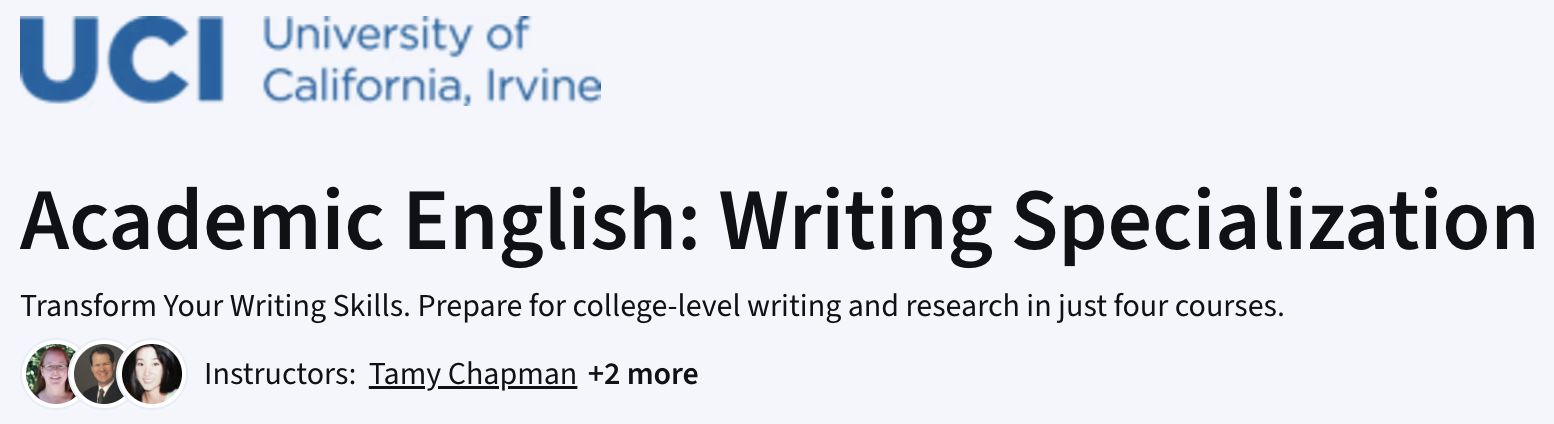 The skills taught in this Specialization will empower you to succeed in any college-level course or professional field. You’ll learn to conduct rigorous academic research and to express your ideas clearly in an academic format. In the final Capstone Project, all the knowledge that you’ve gained over the span of these courses will culminate into an academic research paper on an issue of your choice.