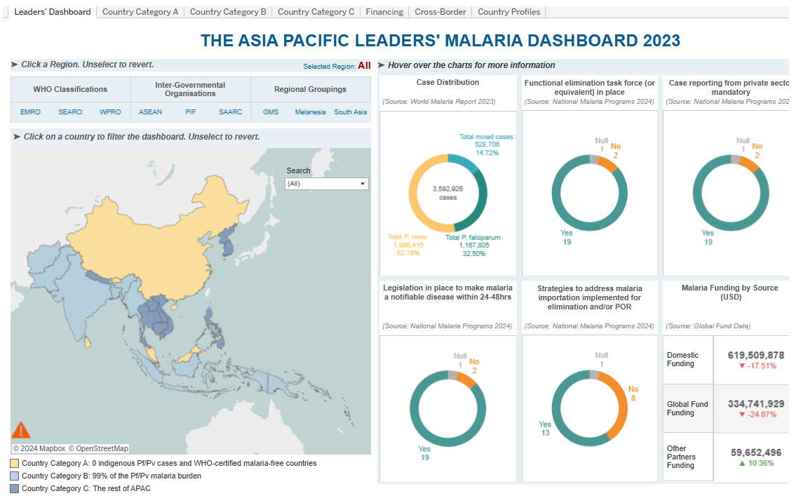 The APLMA Leaders’ Dashboard (the Dashboard) is the mechanism to help countries track progress towards the 2030 goal. It highlights bottlenecks, encourages prompt action, serves as a key advocacy tool to demonstrate progress in the region, and leverages Governments’ and partners continued support for financing malaria elimination.
