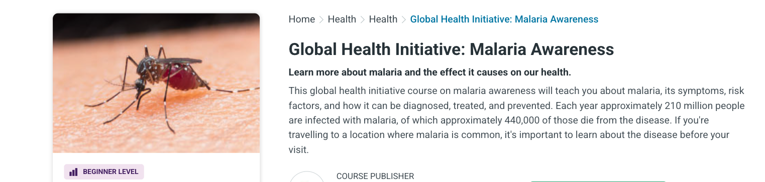 This global health initiative course on malaria awareness will teach you about malaria, its symptoms, risk factors, and how it can be diagnosed, treated, and prevented. Each year approximately 210 million people are infected with malaria, of which approximately 440,000 of those die from the disease. If you are traveling to a location where malaria is common, it’s important to learn about the disease before your visit.
