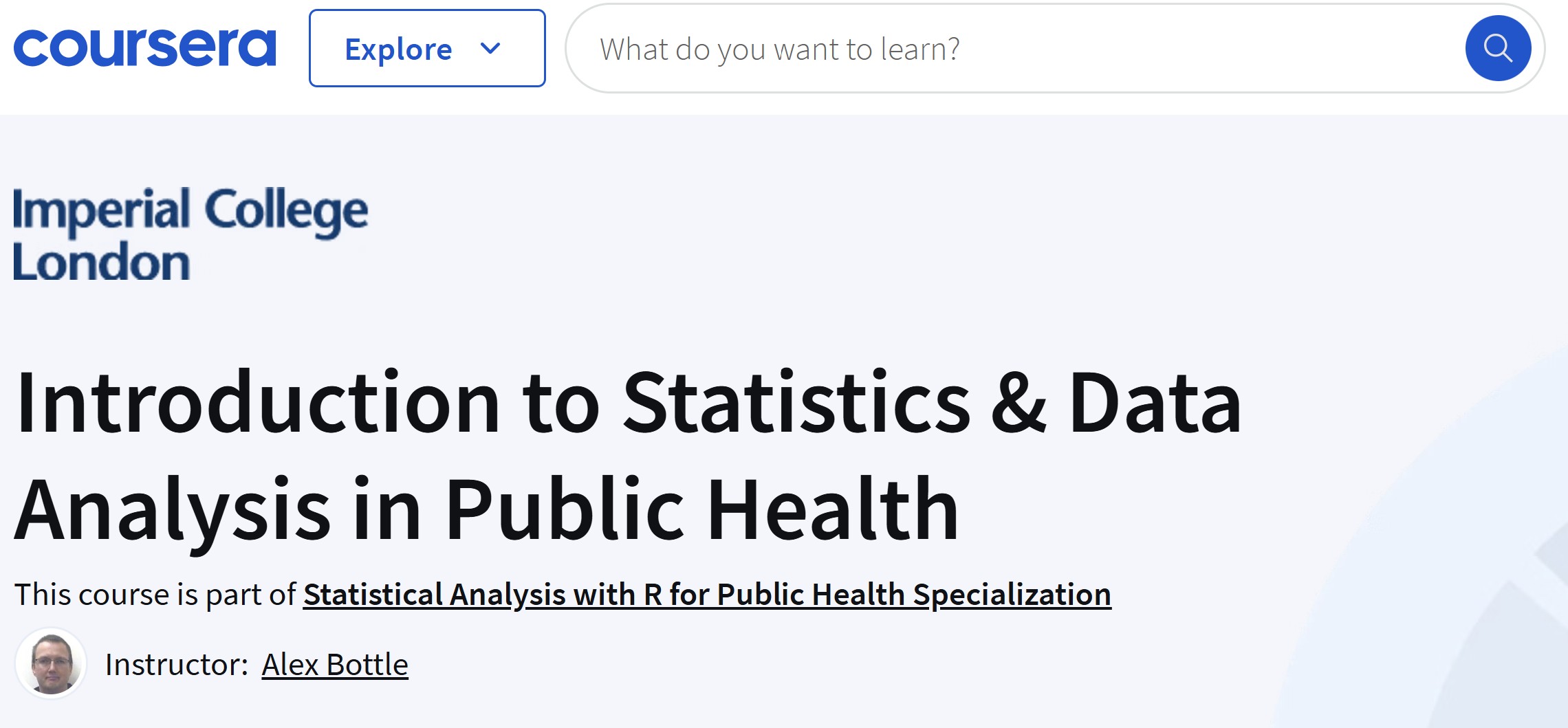 The Introduction to Statistics & Data Analysis in Public Health on the Coursera platform is composed of 4 course series:
