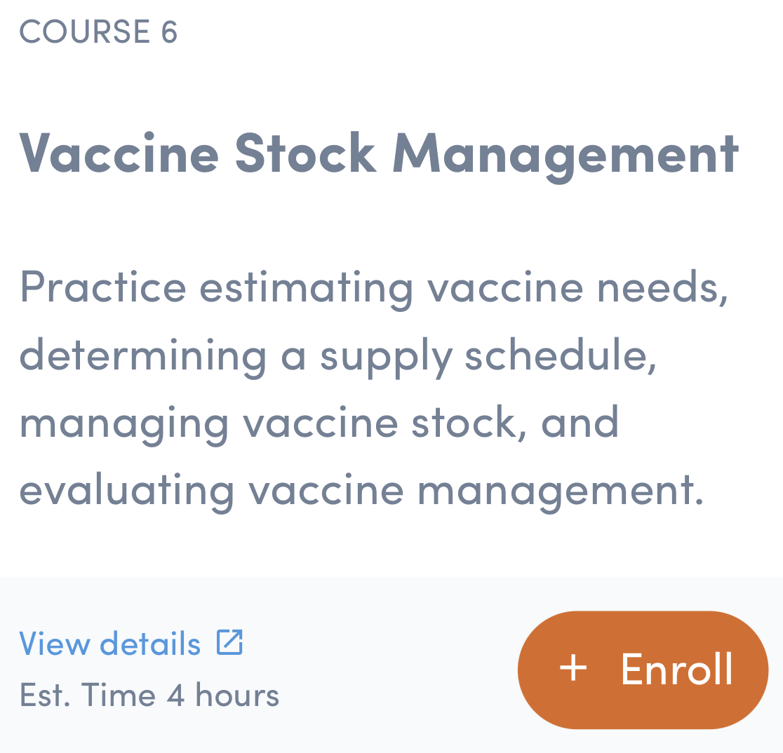 An effective vaccine stock management system ensures that the right product is available in the right quantity at the right time and in the right condition. In this module, you will practice estimating vaccine needs, determining a supply schedule, managing vaccine stock, and evaluating vaccine management.