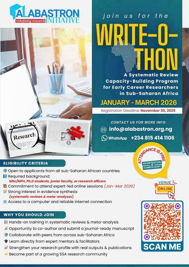 Alabastron invites early career researchers across sub-Saharan Africa to join a focused, hands-on “Write-o-thom: A Systematic Review Capacity-Building Program for Early Career Researchers in Sub-Saharan Africa” designed to build capacity in systematic reviews and meta-analysis. Running from January to March 2026, this online programme pairs participants with expert mentors and peer teams to produce journal-ready systematic review outputs and strengthen research profiles across the region.