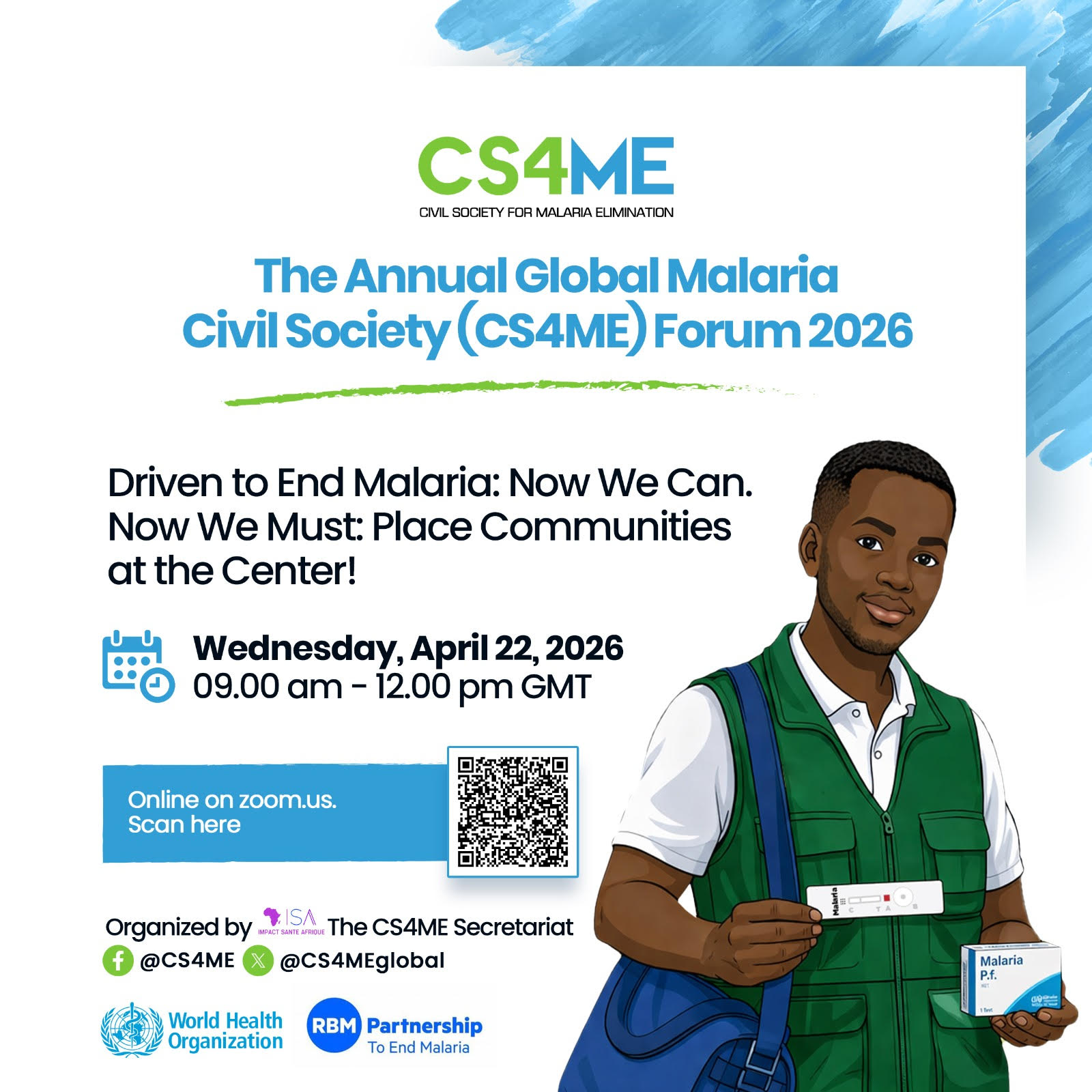 In commemoration of World Malaria Day 2026, Impact Santé Afrique (ISA) who hosts the CS4ME Secretariat, is organizing the CS4ME ANNUAL Forum 2026, under the theme “Driven to End Malaria: Now We Can. Now We Must: Place Communities First!”.