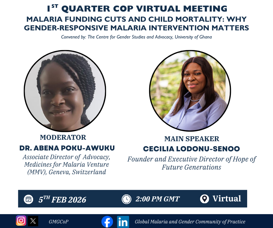 Global Malaria & Gender CoP is organizing the first webinar of this year on: Malaria Funding Cuts and Child Mortality- Why Gender-responsive Malaria Intervention matters, convened by The Centre Studies of Advocacy, University of Ghana.