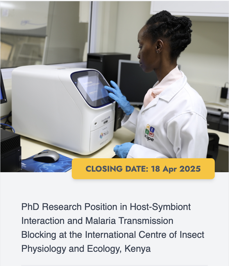 The International Centre of Insect Physiology and Ecology (icipe) is offering one PhD research project on "The effect of host-symbiont interaction on Microsporidia MB-based Plasmodium transmission blocking and host fitness" as part of the African Regional Postgraduate Programme in Insect Sciences (ARPPIS). Application Deadline: 18th April 2025.