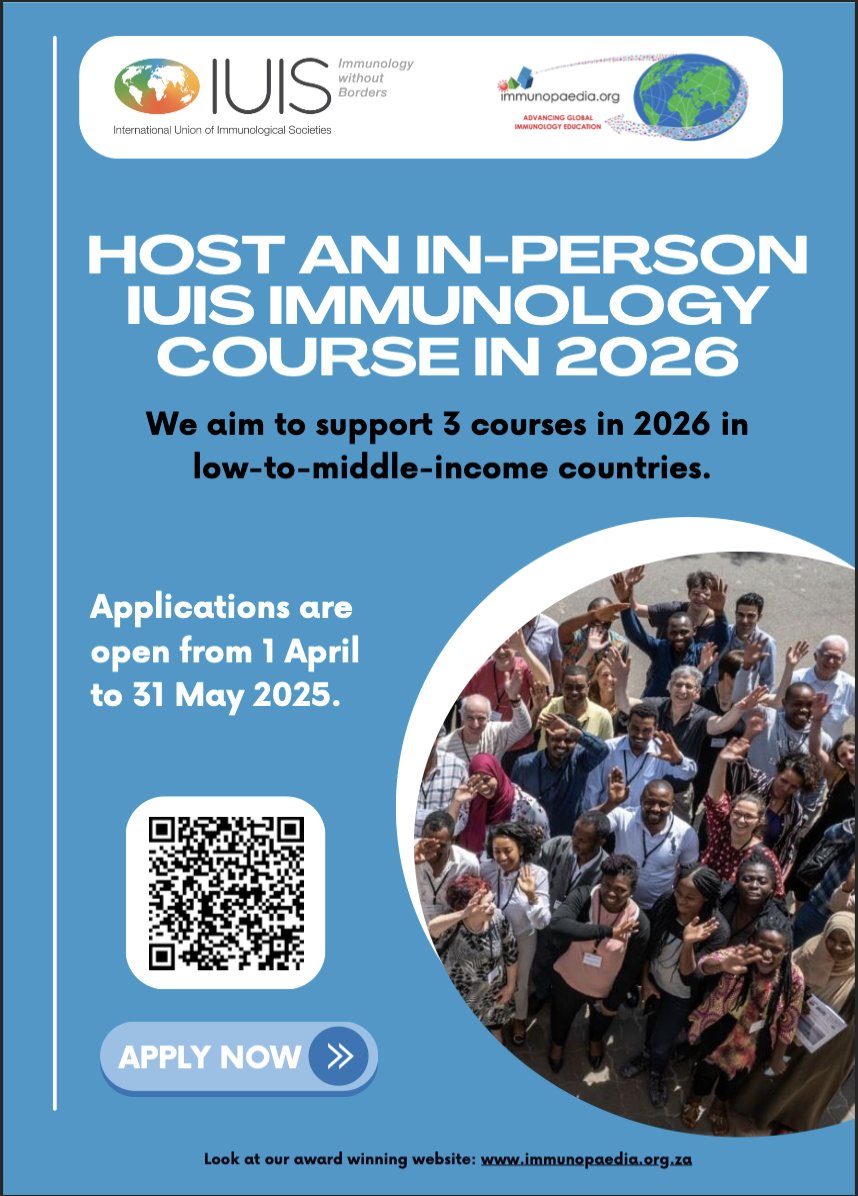 The International Union of Immunological Societies (IUIS) calls for applications to host and IUIS course in 2026. The call aims to support 3 courses in 2026 in low to middle income countries. Application deadline, 31st of May 2025.