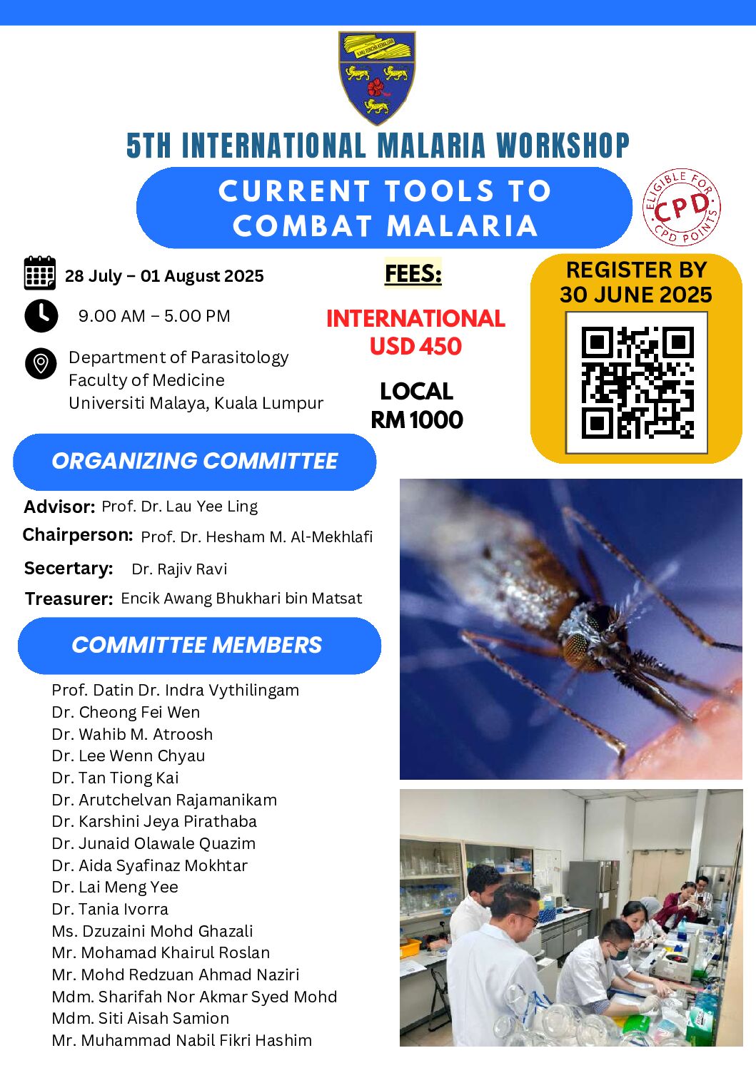 The Department of Parasitology at the Faculty of Medicine, University Malaya, is conducting the ‘5th International Malaria Workshop: Current Tools to Combat Malaria‘, targeting 20 participants from Malaysia and other countries on July 28 – August 01, 2025, in the University Malaya, Kuala Lumpur, Malaysia. Registration deadline June 30, 2025.
