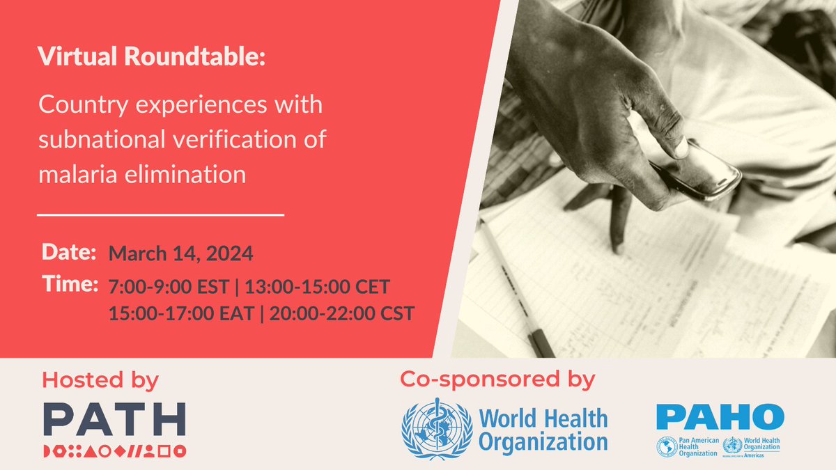 Path cordially invite you to the webinar entitled "Virtual Roundtable: Country experiences with subnational verification of malaria elimination". This event is co-sponsored by the World Health Organization (WHO) and the Pan American Health Organization/World Health Organization (PAHO/WHO).It will take place on March 14, 2024.