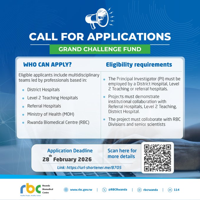 The Rwanda Biomedical Centre is calling for applications for its Grand Challenge Fund to support collaborative, implementation-focused projects that: (i) Improve quality, efficiency, and equity of health services; (ii) Strengthen implementation of national policies, guidelines, and innovations; and (iii) Generate actionable evidence.
