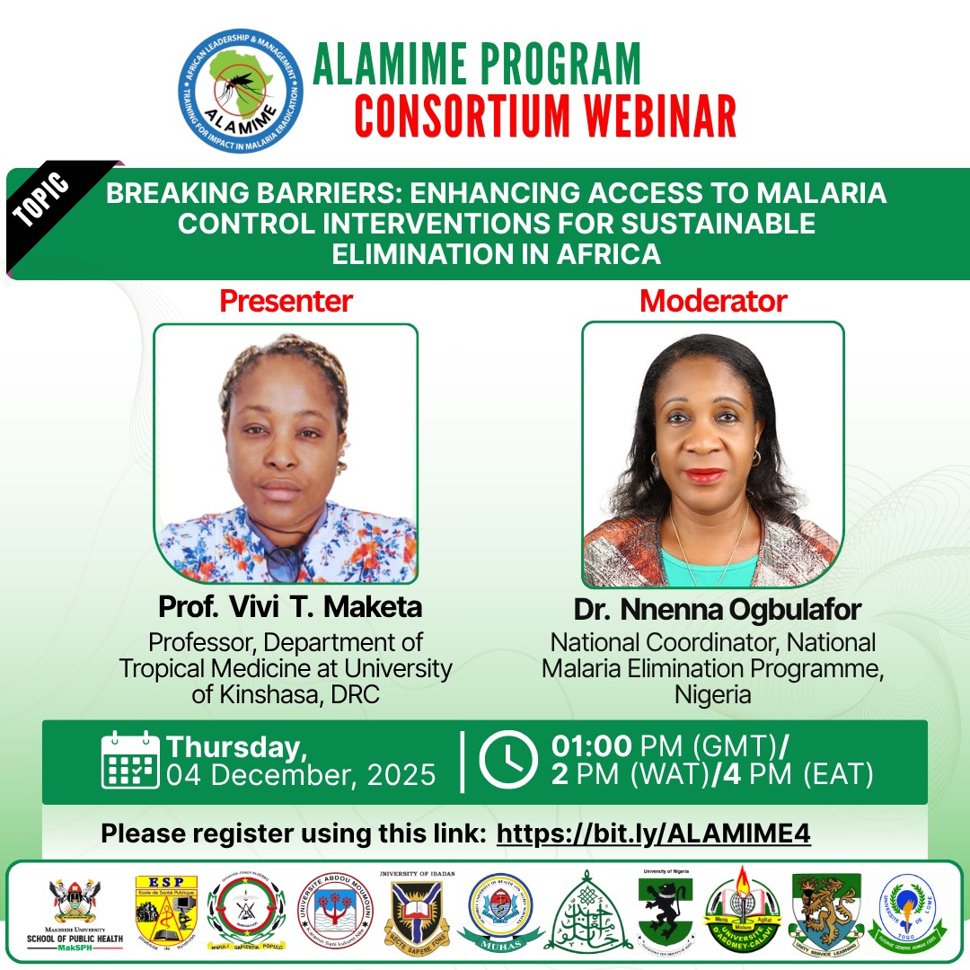 The African Leadership and Management Training for Impact in Malaria Eradication (ALAMIME) program is holding its fourth consortium webinar entitled “Breaking Barriers: Enhancing Access to Malaria Control Interventions for Sustainable Elimination in Africa“. It will convene academics, policymakers & managers from 9 malaria-endemic nations to critically reflect on Africa’s malaria elimination journey.